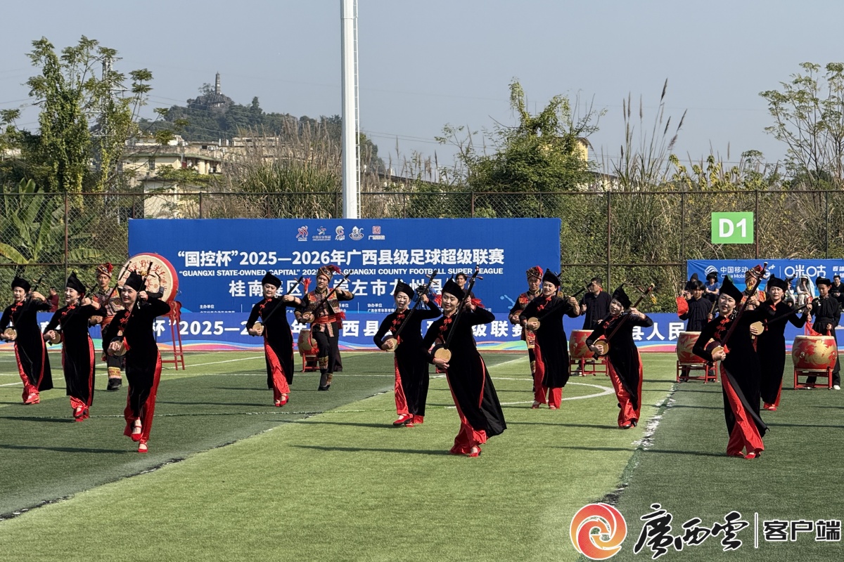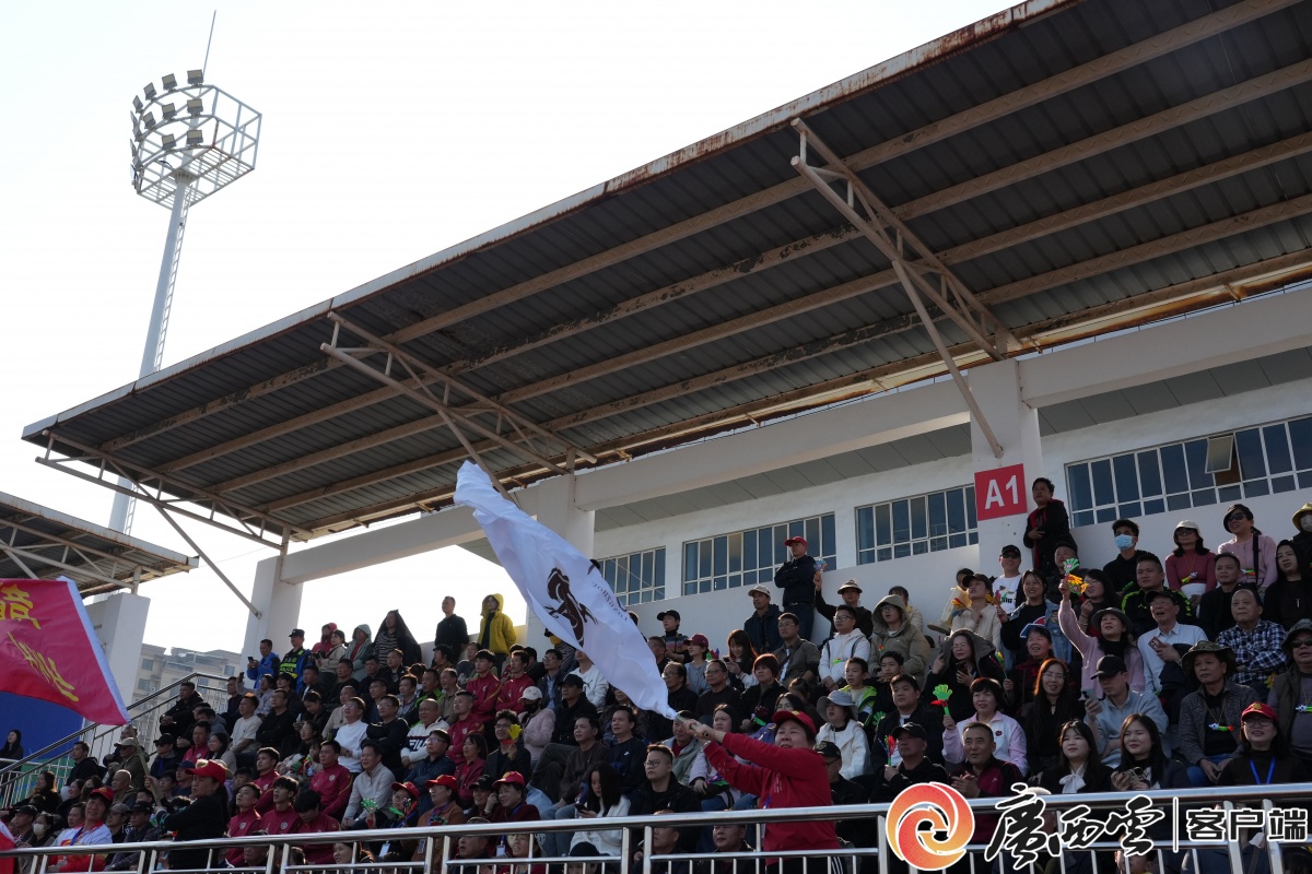 开赛前,观众席早已座无虚席,不少人扒着围栏翘首以待,现场气氛在阵阵欢呼与交谈中不断升温。赛前,壮族天琴表演《天之琴》以清越琴音与激昂鼓点点燃全场;中场时分,山歌歌王罗凤梅携手童声团队献上壮语表演《山歌唤春归·礼赞新时代》,本土乐队“鼎叮组合”则带来歌曲《尼哈嘹啰》,并带动全场齐唱《歌唱祖国》,民族风情与家国情怀在此交融。