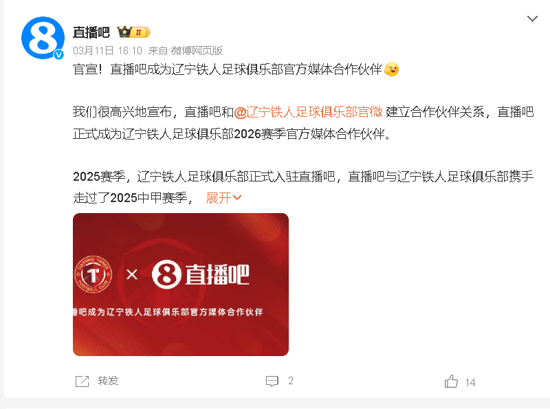 黄强歪谈体育认为,今年辽宁铁大手笔投入,一点不逊色传统豪门,正是这样,引起直播吧这种商业大佬的关注,他们给辽宁铁人投入大量的资源,把这支球队打造成为中超豪门球队,让他们的知名度盖过上海海港、山东泰山、北京国安这种传统豪门球队,很多人看到这里是否有点羡慕辽宁铁人,他们是如何做到让全民喜欢,让直播吧这种商业巨头都另眼相看?直播吧×辽宁铁人的官宣,不是一次简单的商业合作,而是一场关于“中国足球该向何处去”的宣言,当流量掌握在球迷手中,当草根球队能靠智慧逆袭,中超的“金元时代”,该结束了。“你觉得中超该设‘流量冠军奖’吗?评论区留言