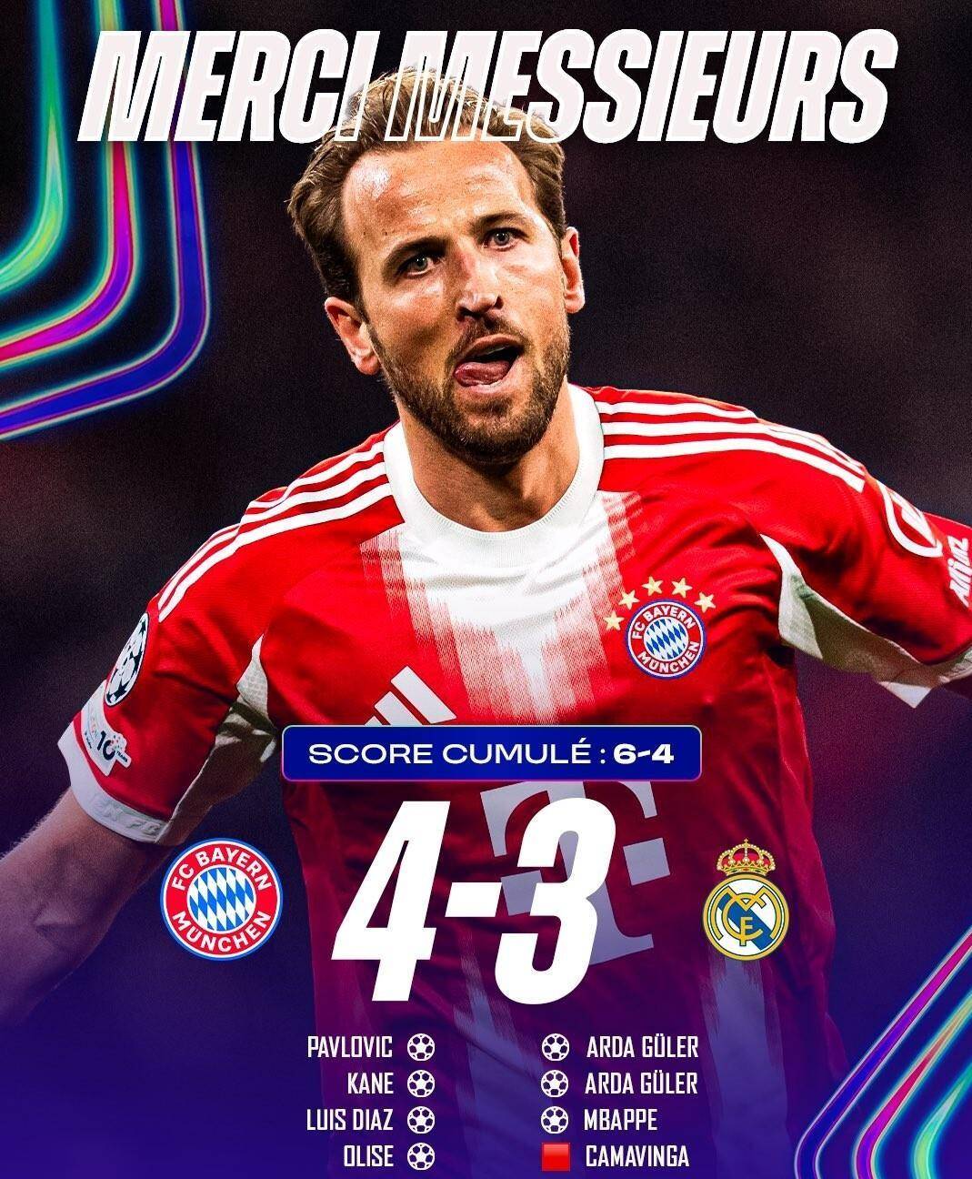 拜仁在最后时刻将比分改写为4-3,也彻底杀死了比赛的悬念。 终场哨响,拜仁慕尼黑主场4-3战胜十人皇家马德里,以两回合总比分6-4成功晋级欧冠半决赛。 居莱尔虽然独中两元,却无法挽救球队被淘汰的命运。