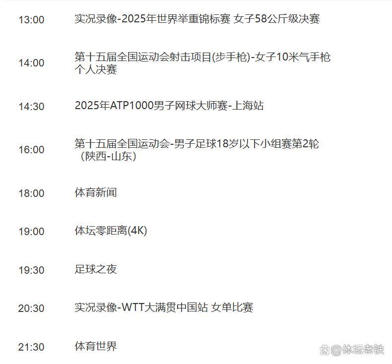 当然,晚间节目不是从8点半才开始。 下午2点30分,ATP上海大师赛的直播就拉开了序幕。 德约科维奇和阿尔卡拉斯的四强战重演,去年那场抢七大战还让人记忆犹新。 紧接着4点钟,第十五届全运会男足U18小组赛,陕西队对阵山东队。
